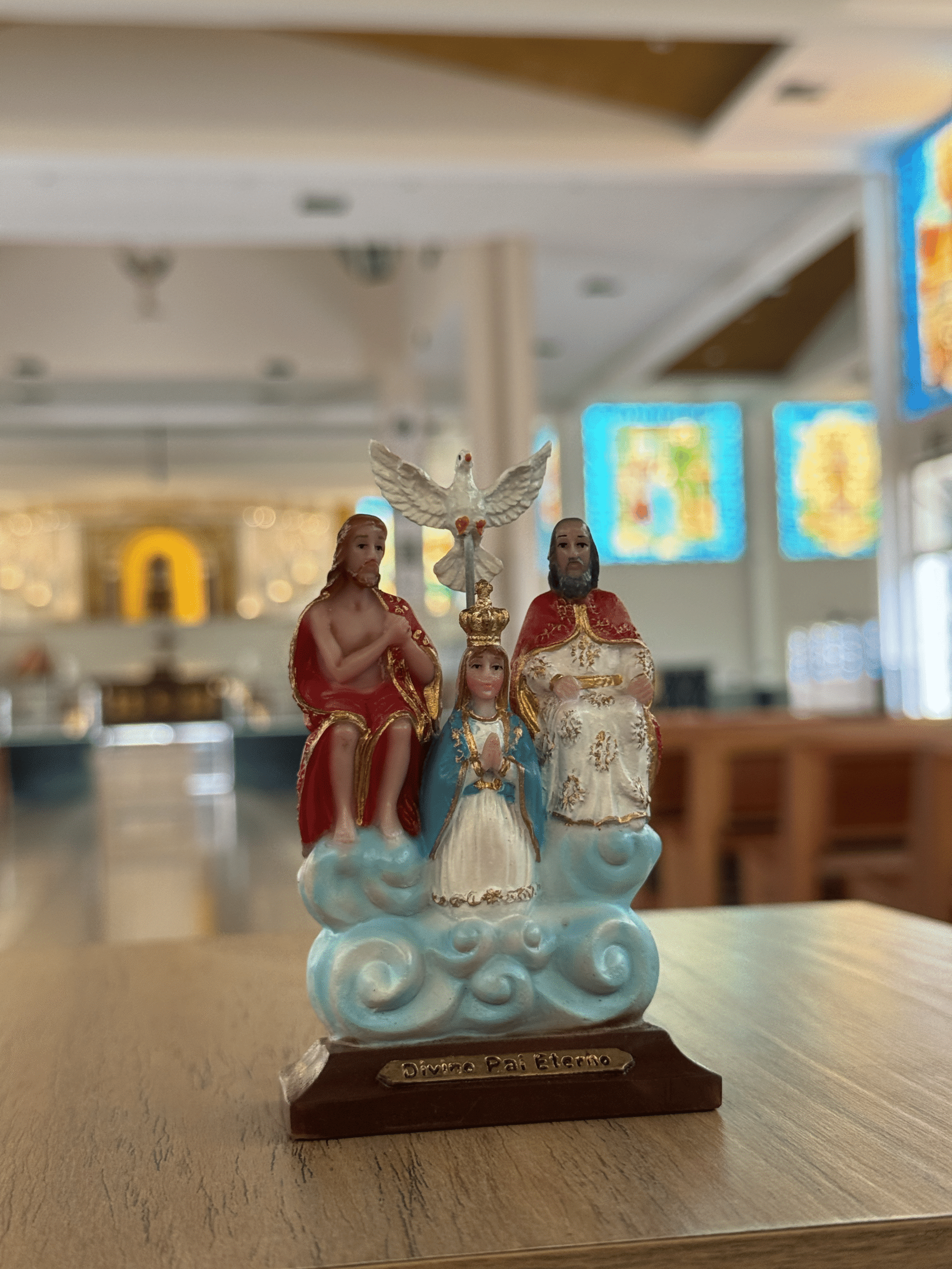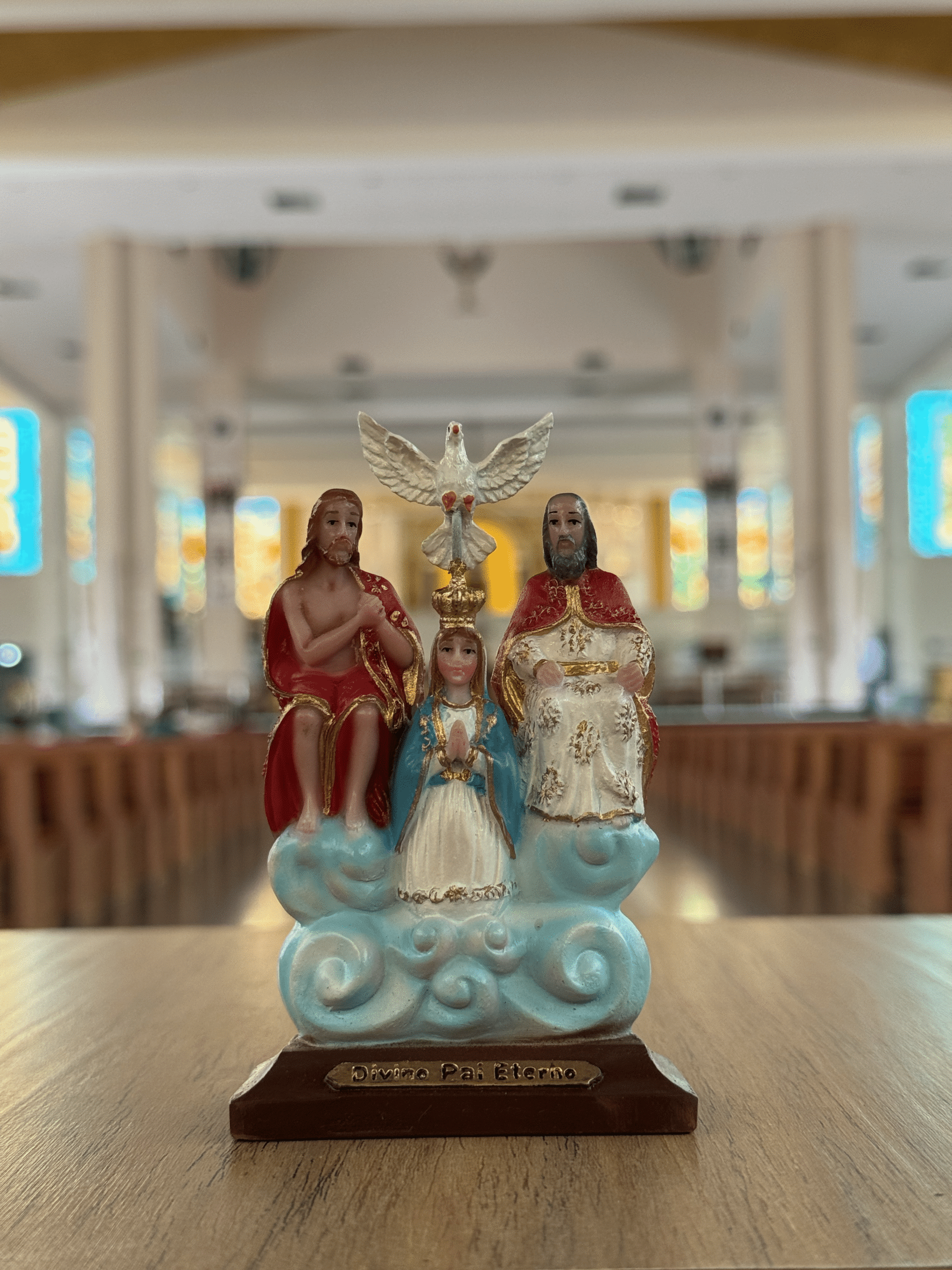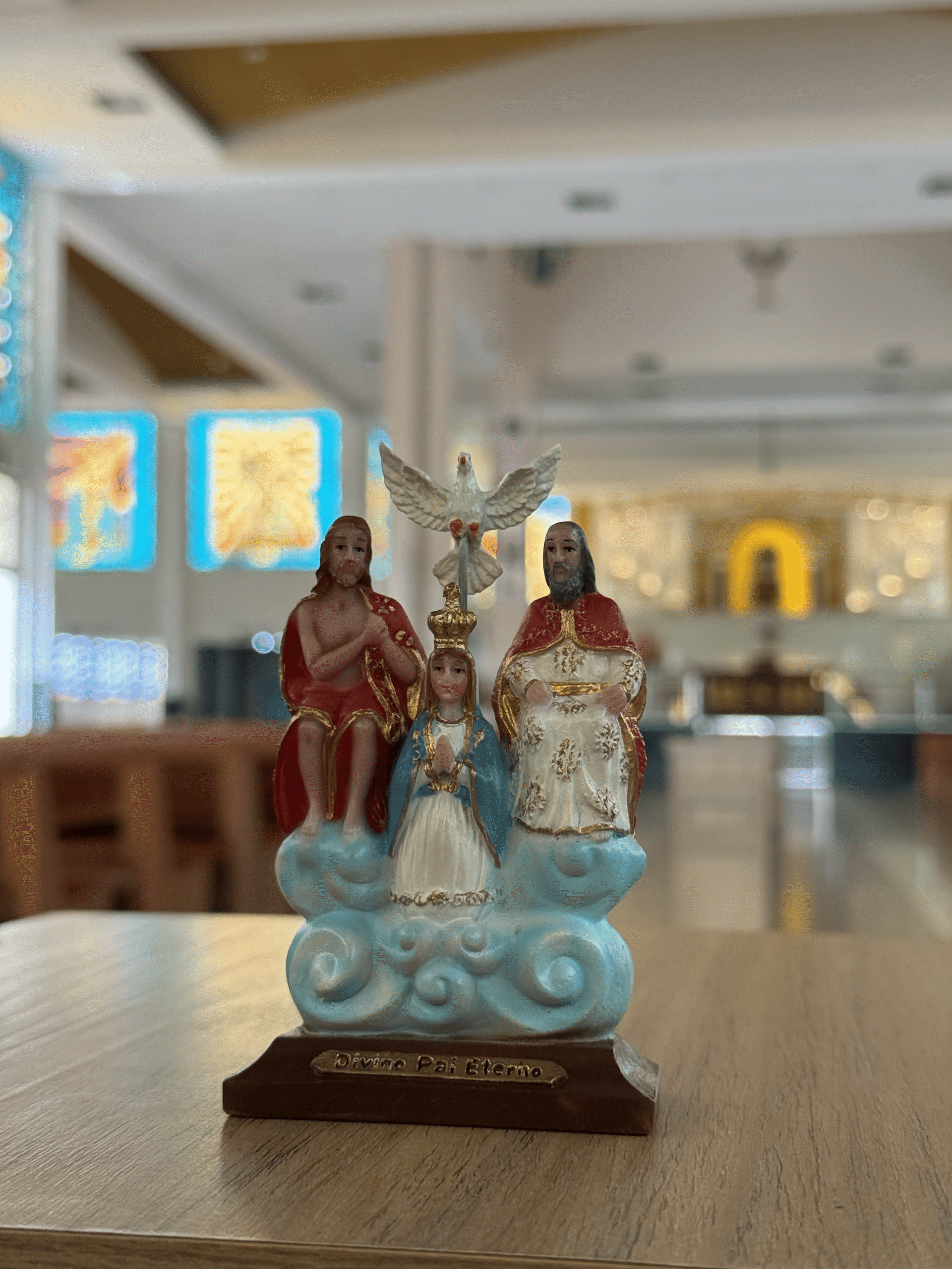 Imagem do Divino Pai Eterno feita em resina, com a nuvem azul.